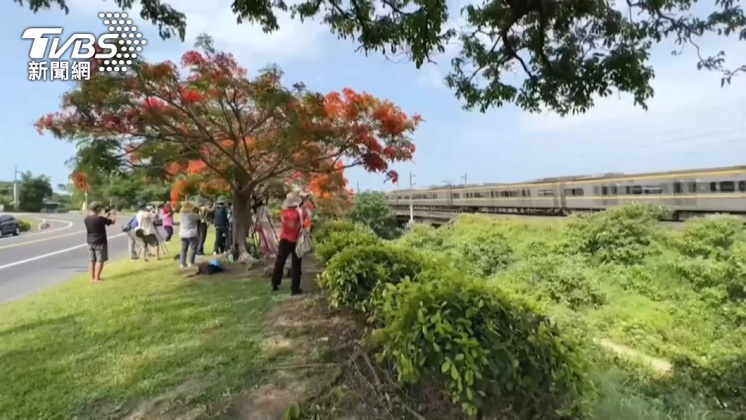 鳳凰花開,樹梢火紅的顏色,點綴這一季美景。苗栗紅花火車熱門景點在這裡,苗栗造橋。攝影愛好者,等著火車經過的瞬間,拍下鳳凰花與列車同框的畫面。
