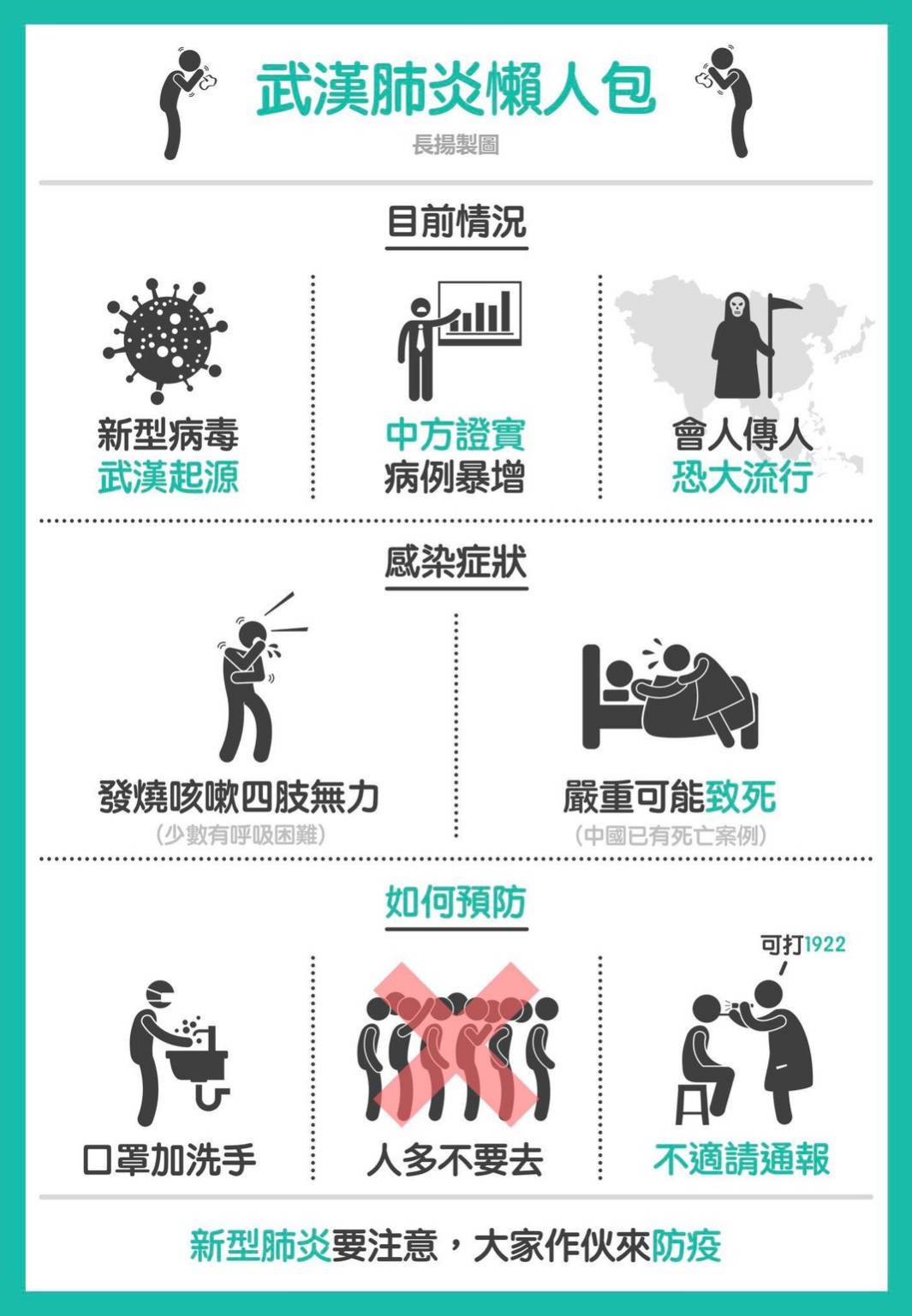 2019年12月以來,湖北省武漢市展開呼吸道疾病及相關疾病監測,發現不明原因病毒性肺炎病例。個案臨床表現主要為發熱,少數病人呼吸困難,胸部X光片呈雙肺浸潤性病灶。